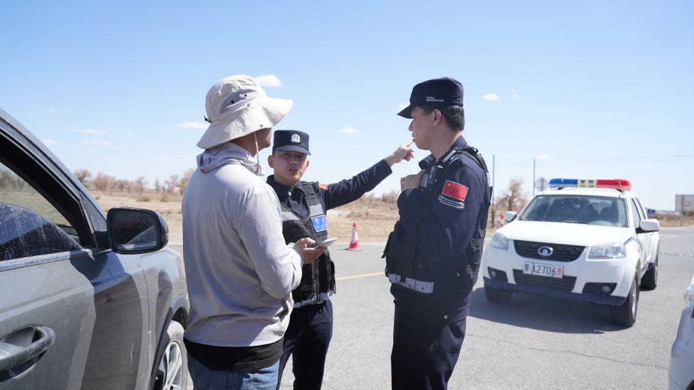 阿拉善邊境管理支隊民警在發(fā)射場外圍疏散來往車輛。