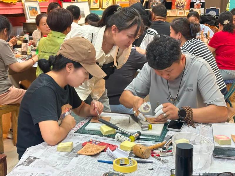 連日來,皮雕技藝培訓(xùn)班也在如火如荼開展。自治區(qū)級(jí)非遺項(xiàng)目皮雕技藝傳承人溫都爾木現(xiàn)場(chǎng)指導(dǎo)學(xué)員制作傳統(tǒng)皮雕,并將皮雕技藝創(chuàng)新應(yīng)用于錢包、腰帶等日常用品?!按舜闻嘤?xùn)吸引了30多名農(nóng)牧民參與,我們不僅傳授傳統(tǒng)皮雕工藝,還教授阿拉善寶石鑲嵌技法,助力農(nóng)牧民掌握增收新技能,實(shí)現(xiàn)技藝傳承與增收致富雙贏。”溫都爾木告訴記者。