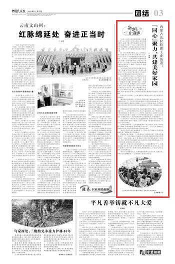 2025年12月2日,《中國民族報(bào)》第3版刊發(fā)題為《內(nèi)蒙古達(dá)拉特旗工業(yè)街道:“同心”聚力,共建美好家園》的文章,報(bào)道了內(nèi)蒙古達(dá)拉特旗工業(yè)街道以“同心共建、同心共學(xué)、同心共事、同心共樂”的“四心四共”工作法賦能基層治理。打造“同心向暖·花開工業(yè)”民族工作品牌,將民族團(tuán)結(jié)融入基層治理各環(huán)節(jié),奏響了開放包容、融榮共居的和諧樂章。