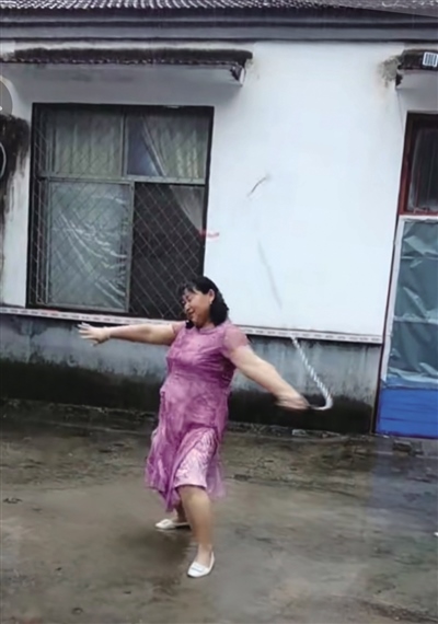 “清水河”大媽與抖音的相遇是在3年前。當(dāng)時(shí),遭遇了親人離世的她悲傷難抑,為了讓她分散注意力,她的女兒幫她下載了抖音。此后,大媽時(shí)常刷刷抖音,也慢慢從中悟出了一個(gè)道理,就是生活中不如意十之八九,人要好好活著,要快樂(lè)地活著。很快,大媽就從悲傷中走了出來(lái),也學(xué)著在抖音上拍攝自己的日常。雖然起初視頻點(diǎn)贊量不多,但能記錄下生活的點(diǎn)滴足以讓她格外開(kāi)心。一直到了去年9月份,大媽無(wú)意之中發(fā)布了一條雨中甩鞭子的視頻。視頻中,大媽身著一襲紅裙,有節(jié)奏地甩起了十幾斤重的鐵制麒麟鞭?!芭距⑴距⑴距甭暵曧懥?、威風(fēng)凜凜。就是這條視頻讓她一夜爆紅。此后短短幾天,這條視頻的點(diǎn)贊量就突破了200萬(wàn),一時(shí)間,抖音上還掀起了一陣和大媽合拍的熱潮。