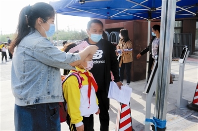 “等了這么久,終于可以和同學(xué)們說(shuō)句:早上好?!?月2日,早上7點(diǎn)剛過(guò),通遼新城第一中學(xué)小學(xué)部二年一班的班主任崔老師早早的在校門口,迎接班里的小朋友們。記者在校門口看到,此時(shí),小學(xué)部二、三年級(jí)的小朋友已經(jīng)陸續(xù)入校了,顯然,“萌娃”們已經(jīng)被校門口的層層關(guān)卡震撼到了,幸好,在眾多老師的幫助和指引下順利進(jìn)入了校門。進(jìn)入了校門后,還有一道重要關(guān)卡,測(cè)量體溫,習(xí)慣了伸出手臂來(lái)測(cè)量體溫的“萌娃”們,對(duì)著紅外線測(cè)溫儀卻不知所措了,有的對(duì)著測(cè)溫儀伸出了手臂、有的對(duì)著測(cè)溫儀行禮,著實(shí)“萌”翻了現(xiàn)場(chǎng)所有人?!按蘩蠋煟覀兌枷肽懔??!币姷綆孜恍∨笥岩獪惖礁皟?,崔老師立刻提醒同學(xué)們:我也很想念你們,但是我們要保持“一米”的距離,快去教室吧!小朋友們被“殘忍”拒絕,很是失落。