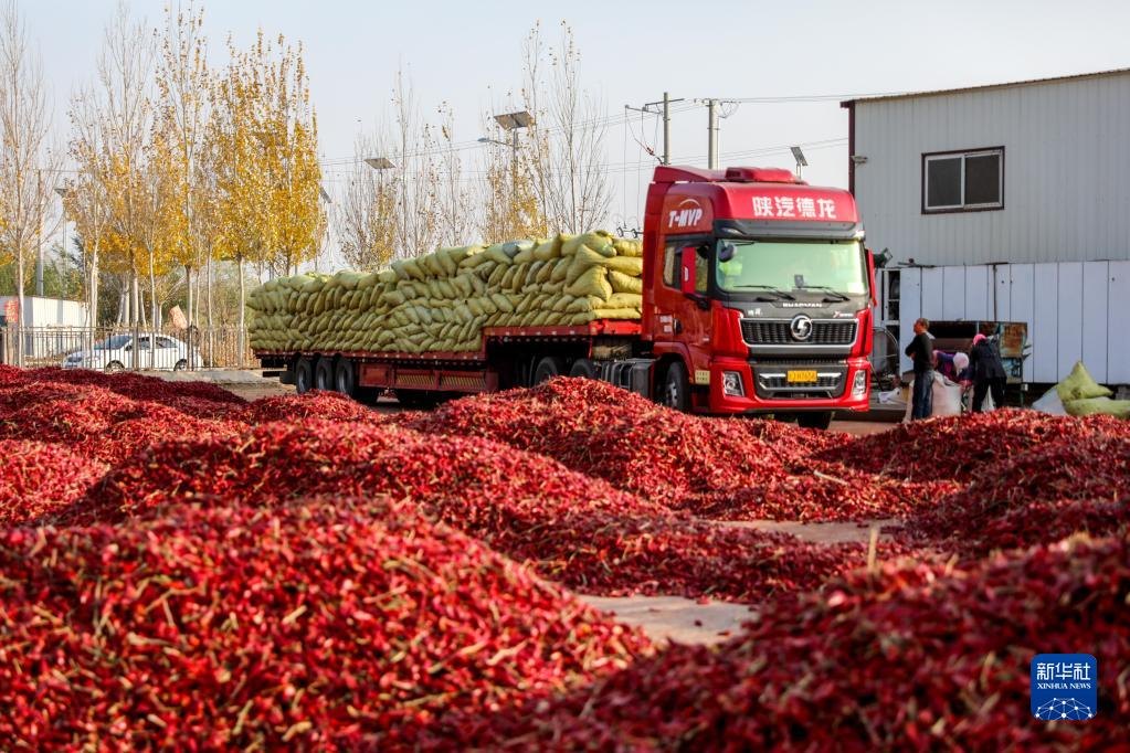 10月25日,在開魯縣東風鎮(zhèn)一家紅干椒銷售企業(yè)的廠區(qū)內,裝滿紅干椒的卡車準備開往四川。新華社記者 連振 攝