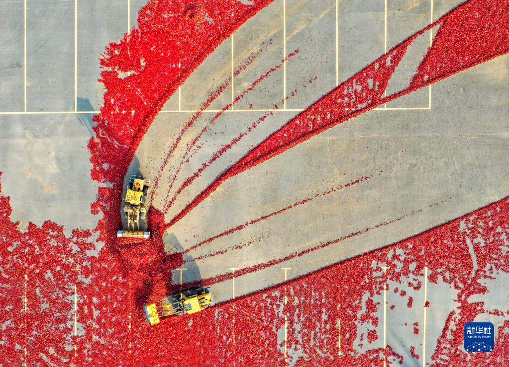 10月25日,在開魯縣東風鎮(zhèn),工作人員駕駛鏟車收獲晾曬好的紅干椒(無人機照片)。新華社記者 連振 攝