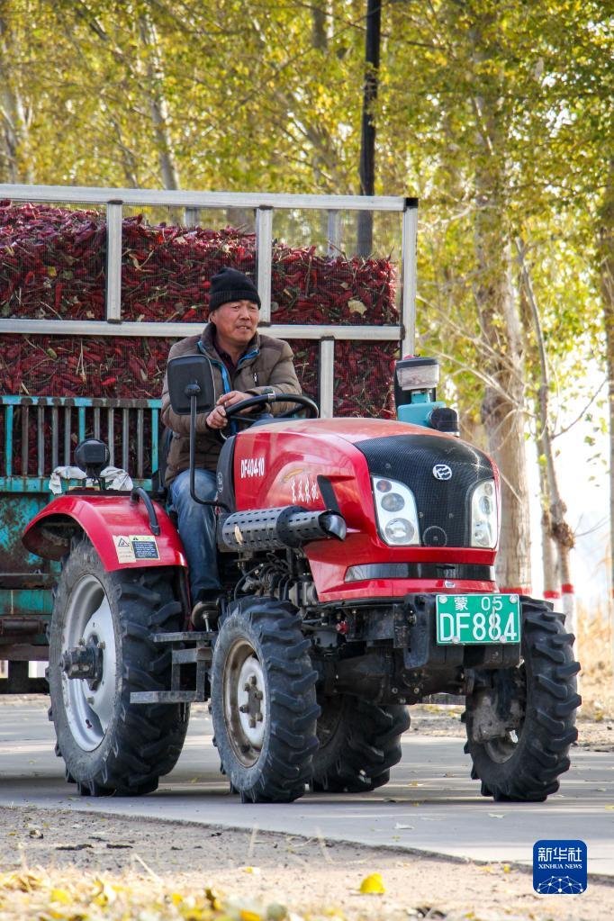 10月25日,在開魯縣東風鎮(zhèn)東方紅村,村民駕駛拖拉機運輸紅干椒。新華社記者 連振 攝
