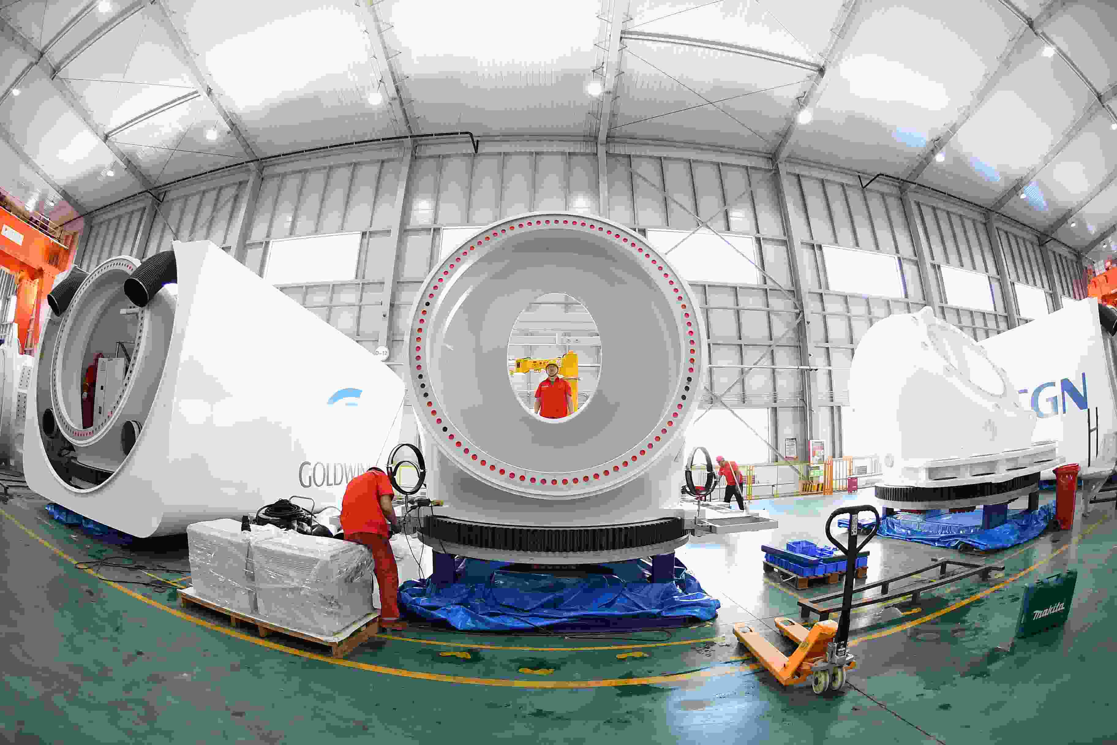 金風(fēng)科技公司工人在安裝風(fēng)機主機。邱金鵬攝