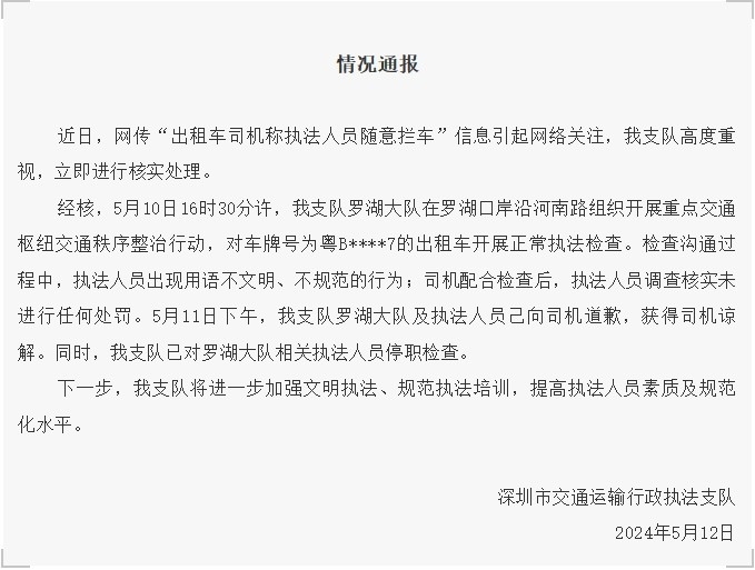 經(jīng)核,5月10日16時(shí)30分許,深圳市交通運(yùn)輸行政執(zhí)法支隊(duì)羅湖大隊(duì)在羅湖口岸沿河南路組織開(kāi)展重點(diǎn)交通樞紐交通秩序整治行動(dòng),對(duì)車牌號(hào)為粵B****7的出租車開(kāi)展正常執(zhí)法檢查。檢查溝通過(guò)程中,執(zhí)法人員出現(xiàn)用語(yǔ)不文明、不規(guī)范的行為;司機(jī)配合檢查后,執(zhí)法人員調(diào)查核實(shí)未進(jìn)行任何處罰。5月11日下午,深圳市交通運(yùn)輸行政執(zhí)法支隊(duì)羅湖大隊(duì)及執(zhí)法人員己向司機(jī)道歉,獲得司機(jī)諒解。同時(shí),深圳市交通運(yùn)輸行政執(zhí)法支隊(duì)已對(duì)羅湖大隊(duì)相關(guān)執(zhí)法人員停職檢查。