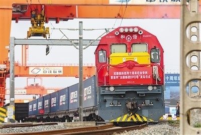 中歐班列是中法進(jìn)出口貿(mào)易的重要橋梁。圖為4月26日,為紀(jì)念成都國(guó)際班列十周年而開(kāi)行的“法國(guó)郵政DPD專(zhuān)列”在四川省成都市青白江區(qū)國(guó)際鐵路港首發(fā)。白桂斌攝(人民視覺(jué))