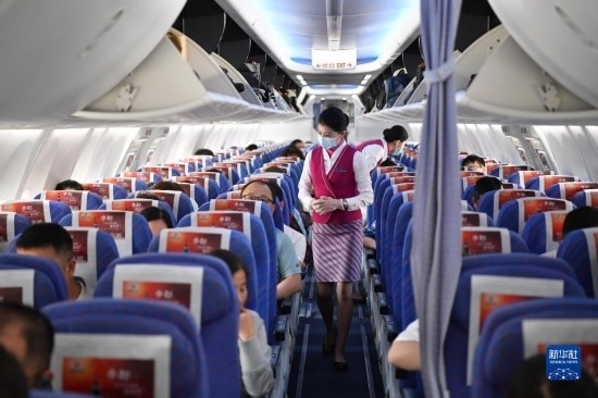 5月13日,在西安-烏魯木齊-阿什哈巴德首趟航班上,乘務員在起飛前進行客艙安全檢查。