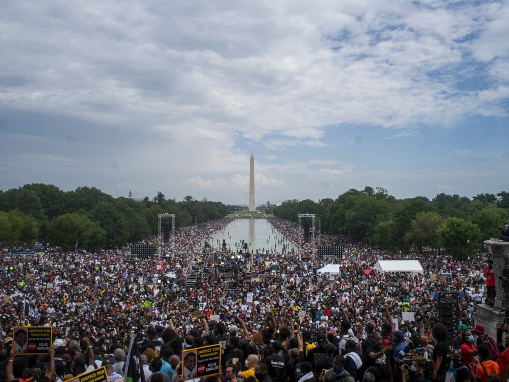 2020年8月28日,人們在美國首都華盛頓林肯紀(jì)念堂附近參加反種族歧視和暴力執(zhí)法示威活動。新華社發(fā)(阿蘭攝)