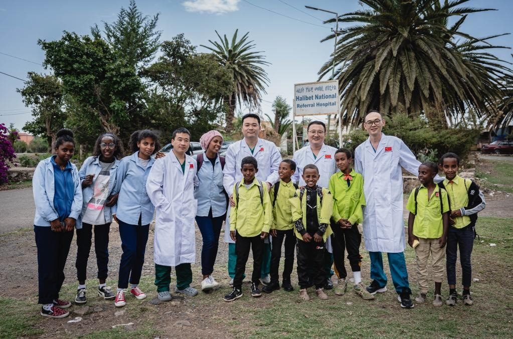 5月9日,在厄立特里亞首都阿斯馬拉的哈利貝特醫(yī)院門(mén)口,中國(guó)醫(yī)療隊(duì)隊(duì)員與附近學(xué)校兒童合影。新華社記者王冠森攝