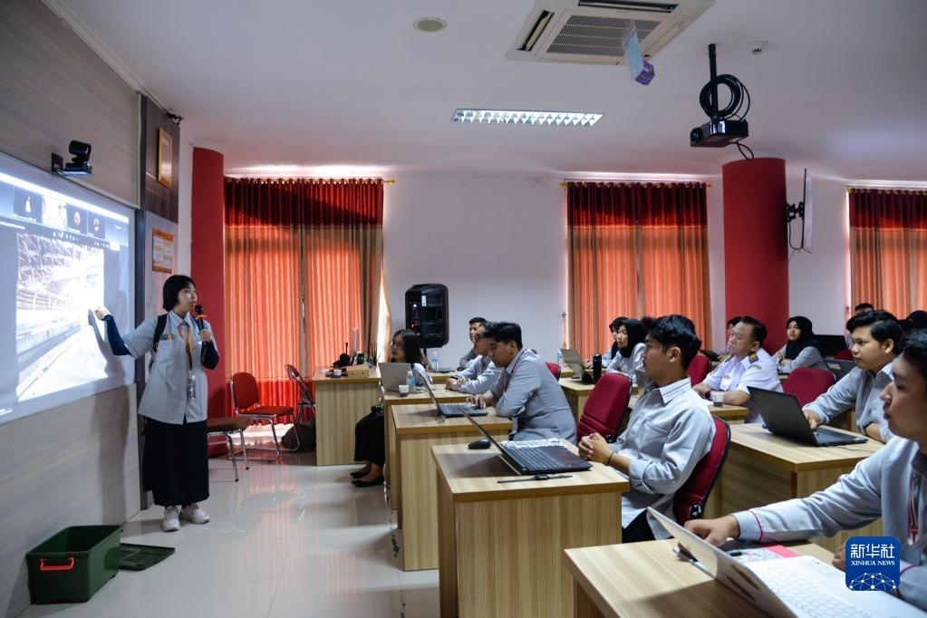 6月7日,在位于印度尼西亞茉莉芬市的印尼鐵路理工學(xué)院,學(xué)員在雅萬高鐵動車組機械師培訓(xùn)班上與翻譯老師互動。 新華社記者 徐欽 攝