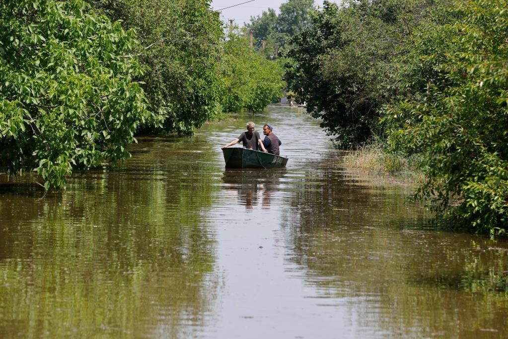 6月8日,人們乘船經(jīng)過赫爾松州被洪水淹沒的地區(qū)。(新華社發(fā) 維克托攝)