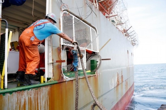 5月30日,聯(lián)合國工程船的船員在該船抵達(dá)也門紅海港口荷臺(tái)達(dá)附近海域后固定船只。新華社發(fā)(默罕默德攝)