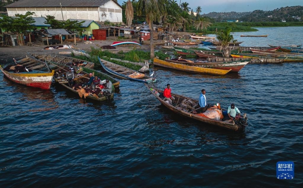 這是6月11日拍攝的坦桑尼亞姆萬扎省維多利亞湖畔的漁船(無人機照片)。