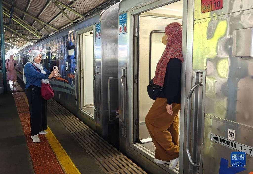 8月27日,乘客在印度尼西亞雅加達(dá)甘比爾車(chē)站的站臺(tái)上拍照(手機(jī)拍攝)。新華社記者 徐欽 攝