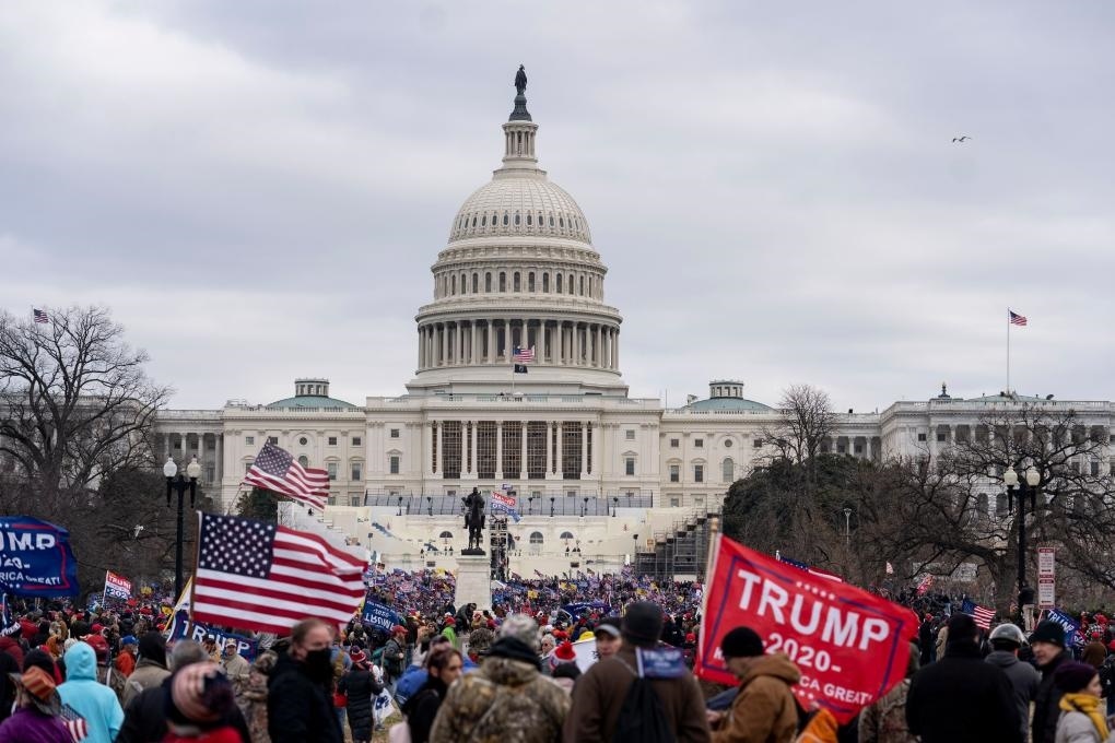 2021年1月6日,在美國(guó)首都華盛頓,時(shí)任總統(tǒng)特朗普的支持者在國(guó)會(huì)外舉行示威游行。部分示威者沖進(jìn)國(guó)會(huì)大廈,與警方發(fā)生沖突。新華社記者劉杰攝