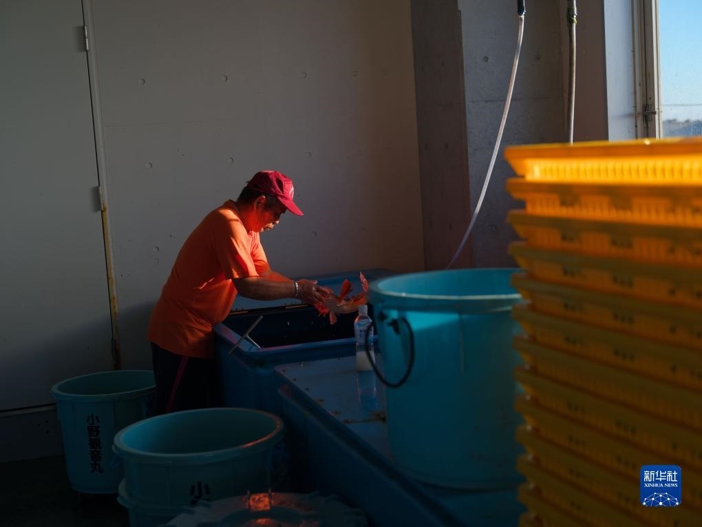 8月23日,打漁歸來(lái)的小野春雄在日本福島縣新地町的漁港處理捕獲的魚(yú)。新華社記者 張笑宇 攝