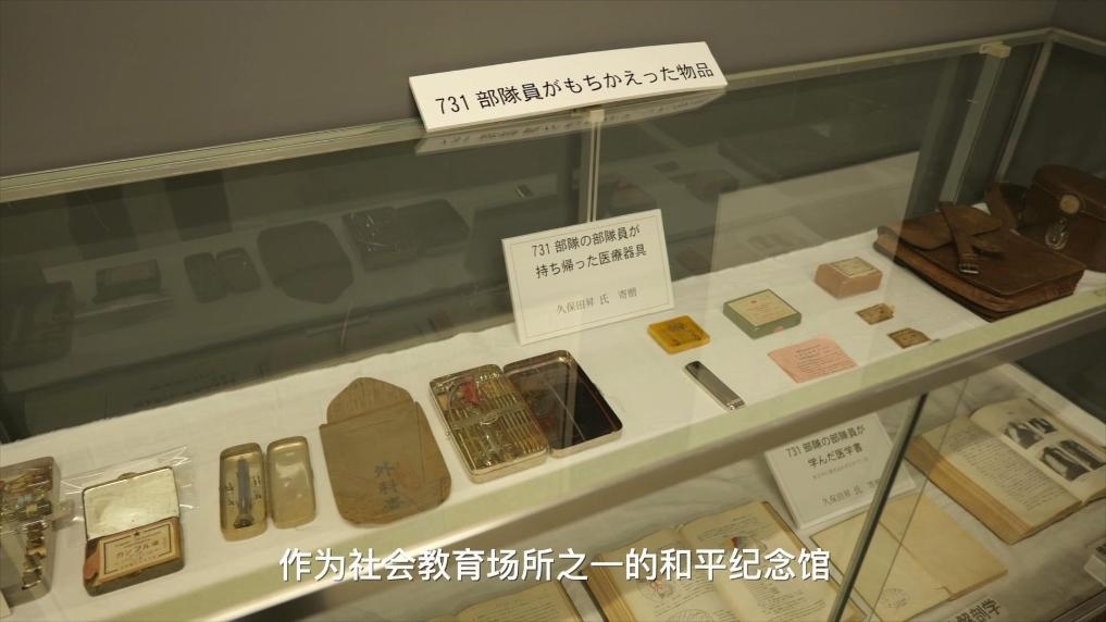 圖為飯?zhí)锸泻推狡砟铕^展廳內展出的胡桃澤從731部隊帶回的手術器具等證物。(視頻截圖)