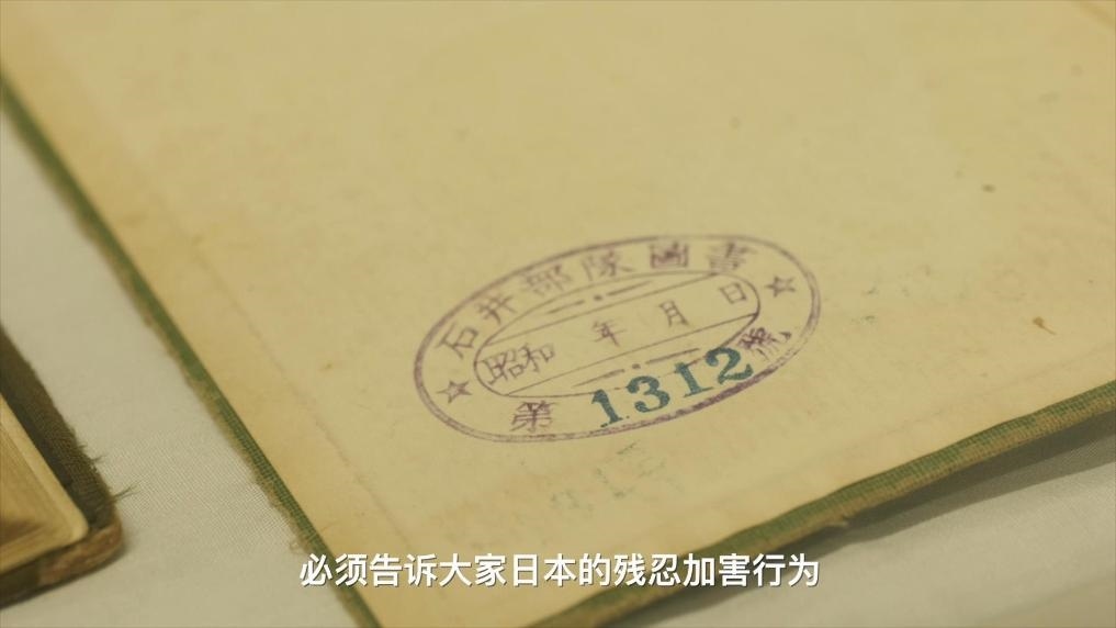 圖為飯?zhí)锸泻推狡砟铕^展廳內展出的蓋有“石井部隊”印章的《人體解剖學》書籍內頁。(視頻截圖)