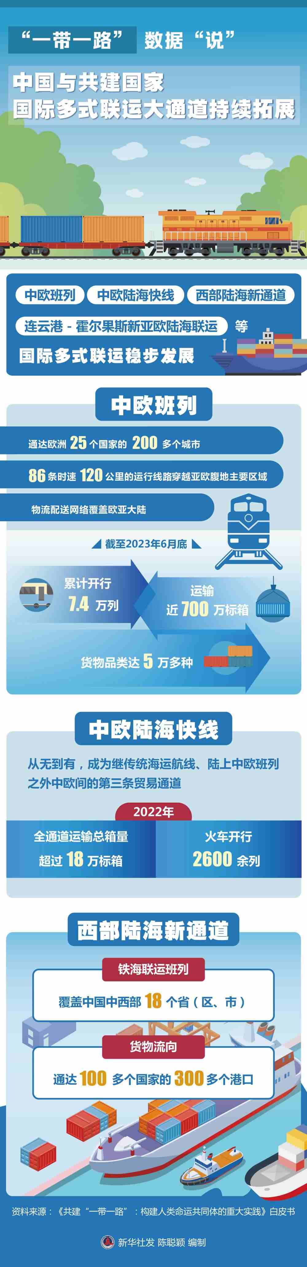 國(guó)際多式聯(lián)運(yùn)大通道持續(xù)拓展。中歐班列、中歐陸??炀€(xiàn)、西部陸海新通道、連云港-霍爾果斯新亞歐陸海聯(lián)運(yùn)等國(guó)際多式聯(lián)運(yùn)穩(wěn)步發(fā)展。中歐班列通達(dá)歐洲25個(gè)國(guó)家的200多個(gè)城市,86條時(shí)速120公里的運(yùn)行線(xiàn)路穿越亞歐腹地主要區(qū)域,物流配送網(wǎng)絡(luò)覆蓋歐亞大陸;截至2023年6月底,中歐班列累計(jì)開(kāi)行7.4萬(wàn)列,運(yùn)輸近700萬(wàn)標(biāo)箱,貨物品類(lèi)達(dá)5萬(wàn)多種,涉及汽車(chē)整車(chē)、機(jī)械設(shè)備、電子產(chǎn)品等53大門(mén)類(lèi),合計(jì)貨值超3000億美元。中歐陸??炀€(xiàn)從無(wú)到有,成為繼傳統(tǒng)海運(yùn)航線(xiàn)、陸上中歐班列之外中歐間的第三條貿(mào)易通道,2022年全通道運(yùn)輸總箱量超過(guò)18萬(wàn)標(biāo)箱,火車(chē)開(kāi)行2600余列。西部陸海新通道鐵海聯(lián)運(yùn)班列覆蓋中國(guó)中西部18個(gè)?。▍^(qū)、市),貨物流向通達(dá)100多個(gè)國(guó)家的300多個(gè)港口。