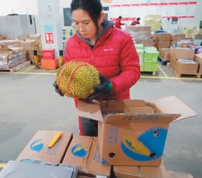 兩個多小時后,在北京市海淀區(qū)的一個快遞站點,京東快遞員侯建東從傳送帶上拿到了一箱榴蓮。