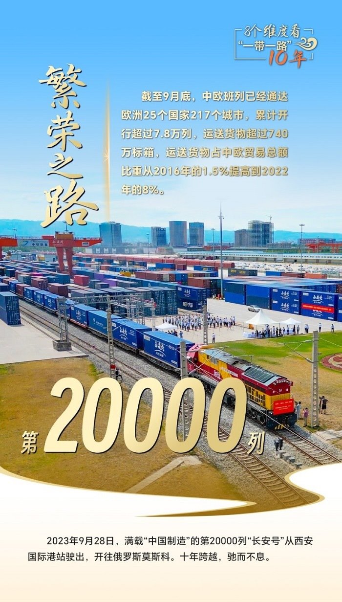 第20000列“長安號”從西安國際港站駛出,給世界送去“中國制造”;中老鐵路突破重山阻隔,成為國際物流的“黃金通道”;蒙內(nèi)鐵路聯(lián)通東西,是東非鐵路網(wǎng)的開端,更是一條充滿希望的經(jīng)濟走廊……一個個合作豐碑,搭建起高效的貿(mào)易通道網(wǎng)絡平臺,助力各國走好走穩(wěn)“一帶一路”這條繁榮之路。