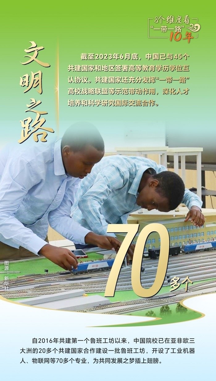 文明因交流而多彩,因互鑒而豐富。作為“一帶一路”的倡導者和推動者,中國也成為促進世界文明交流互鑒的先行者和示范者。截至2023年6月底,中國已與45個共建國家和地區(qū)簽署高等教育學歷學位互認協(xié)議。中國院校在132個共建國家辦有313所孔子學院、315所孔子課堂;“漢語橋”夏令營項目累計邀請100余個共建國家近5萬名青少年來華訪學,支持143個共建國家10萬名中文愛好者線上學習中文、體驗中國文化。