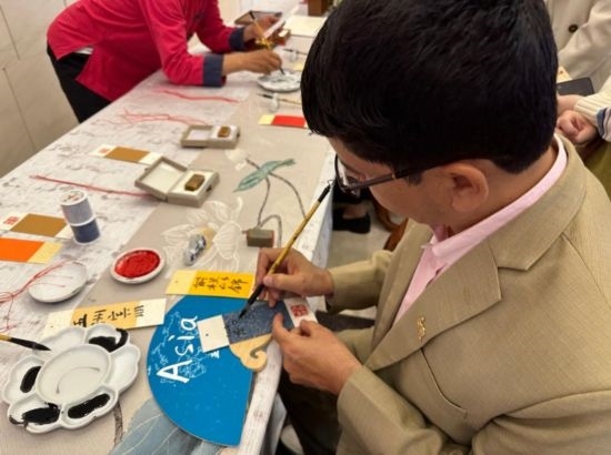 嘉賓體驗(yàn)中國(guó)書法書寫過(guò)程 (新華社記者王艷剛攝)