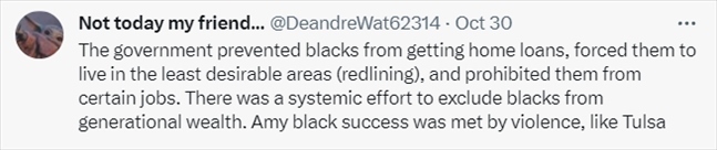 還有網(wǎng)友表示,美國(guó)政府在加劇美國(guó)財(cái)富不平等方面“功不可沒”。在美國(guó)政策高壓之下,非裔甚至不配擁有住房。