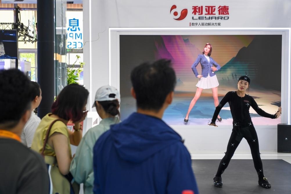 9月5日,在服貿會首鋼園區(qū)的電信、計算機和信息服務專題展內,參觀者觀看一家企業(yè)的數(shù)字人驅動解決方案演示。新華社記者 鞠煥宗 攝