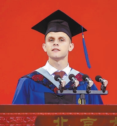 安德里亞在北京大學(xué)畢業(yè)典禮上作為學(xué)生代表發(fā)言。受訪者供圖