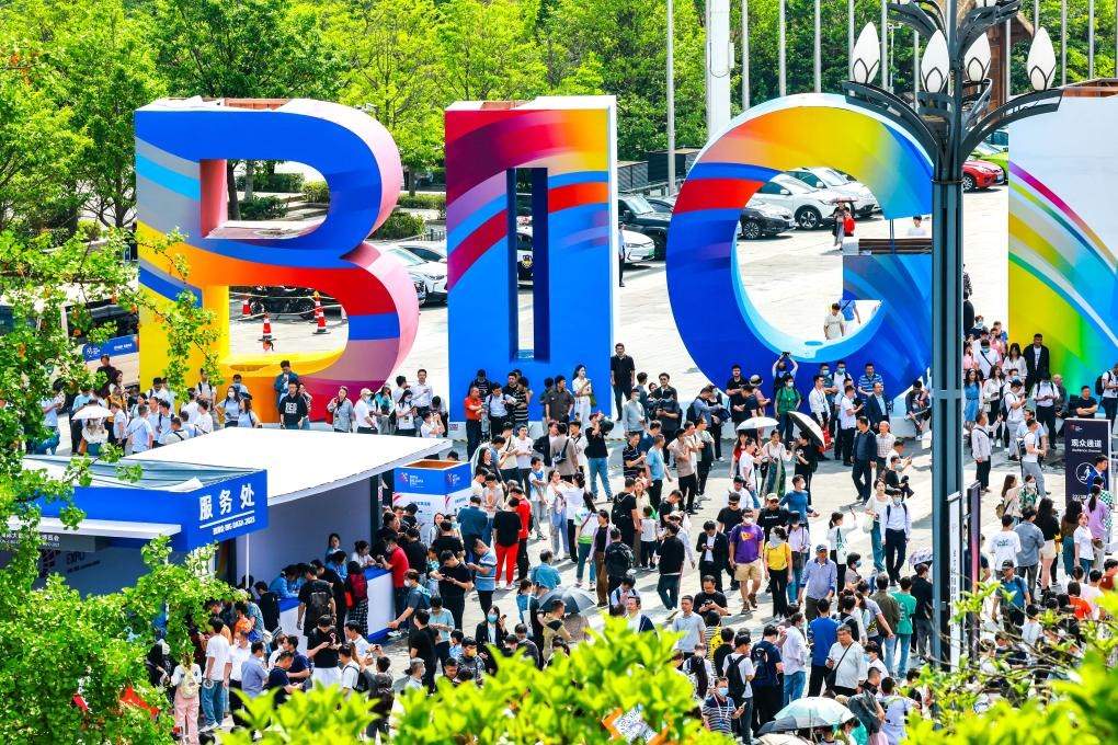 ?2023年5月26日,參會者從中國國際大數(shù)據(jù)產(chǎn)業(yè)博覽會展館外的大數(shù)據(jù)標識前經(jīng)過。新華社記者歐東衢攝