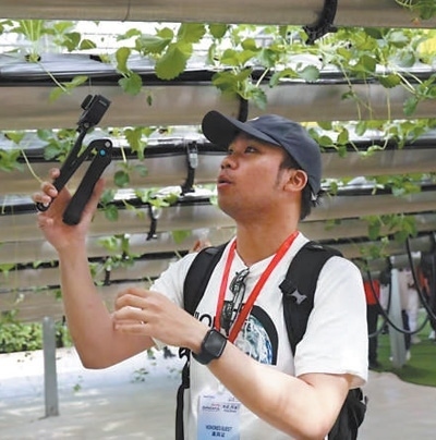 聞名在河南商丘市夏邑縣太平鎮(zhèn)參觀龍港灣空中草莓體驗館的智慧農業(yè)設施并錄制視頻。受訪者供圖