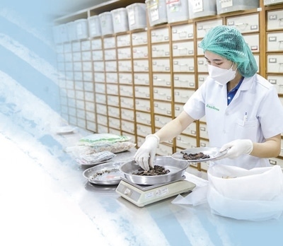 泰國華僑中醫(yī)院藥房內(nèi),工作人員在稱量中藥。 張慧珊攝