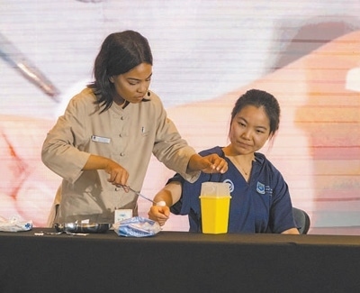 在2023年舉行的第二十二屆“漢語橋”世界大學(xué)生中文比賽南非賽區(qū)決賽中,來自西開普大學(xué)中醫(yī)孔子學(xué)院的學(xué)生希諾(左)展示針灸治療。 本報記者 鄒 松攝
