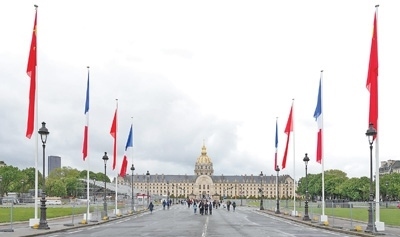 法國巴黎榮軍院前街道兩側(cè)懸掛中法兩國國旗。本報記者 王 遠攝