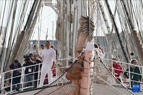 傍晚時分,伴隨著現(xiàn)場觀眾高唱法國國歌《馬賽曲》,“貝勒姆”號緩緩駛進(jìn)港口,著名的“法蘭西巡邏兵”飛行表演隊(duì)從港口上空呼嘯而過,先后展示了奧運(yùn)五環(huán)與法國國旗的圖案。