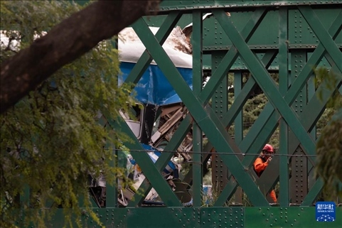 5月10日,救援人員在阿根廷首都布宜諾斯艾利斯火車相撞事故現(xiàn)場工作(無人機(jī)照片)。新華社發(fā)(馬丁·薩巴拉攝)