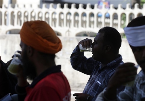 5月27日,在印度北部旁遮普邦阿姆利則地區(qū),人們在炎熱的午后喝路邊售賣的甘蔗汁來消暑。新華社發(fā)(斯特林格攝)