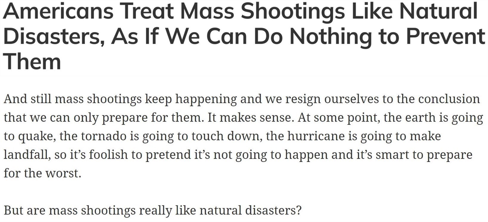 有美媒稱,對于一起又一起槍擊事件,如今的美國只是進(jìn)行數(shù)字的統(tǒng)計(jì),卻無力采取行動改變現(xiàn)狀,似乎在美國人眼里,槍支暴力已經(jīng)成為像洪水、颶風(fēng)、野火一樣的“天災(zāi)”,而不是可以預(yù)防的人禍。