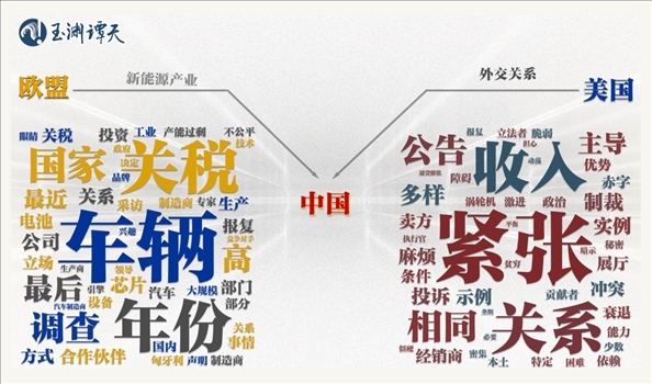 可以看到,以“車輛”“部門”“公司”“制造”等詞為代表的關(guān)鍵詞,都指向了新能源行業(yè)。相比之下,美國媒體對(duì)同一話題的討論,更側(cè)重“緊張”“關(guān)系”“沖突”“政治”等指向外交關(guān)系的關(guān)鍵詞。