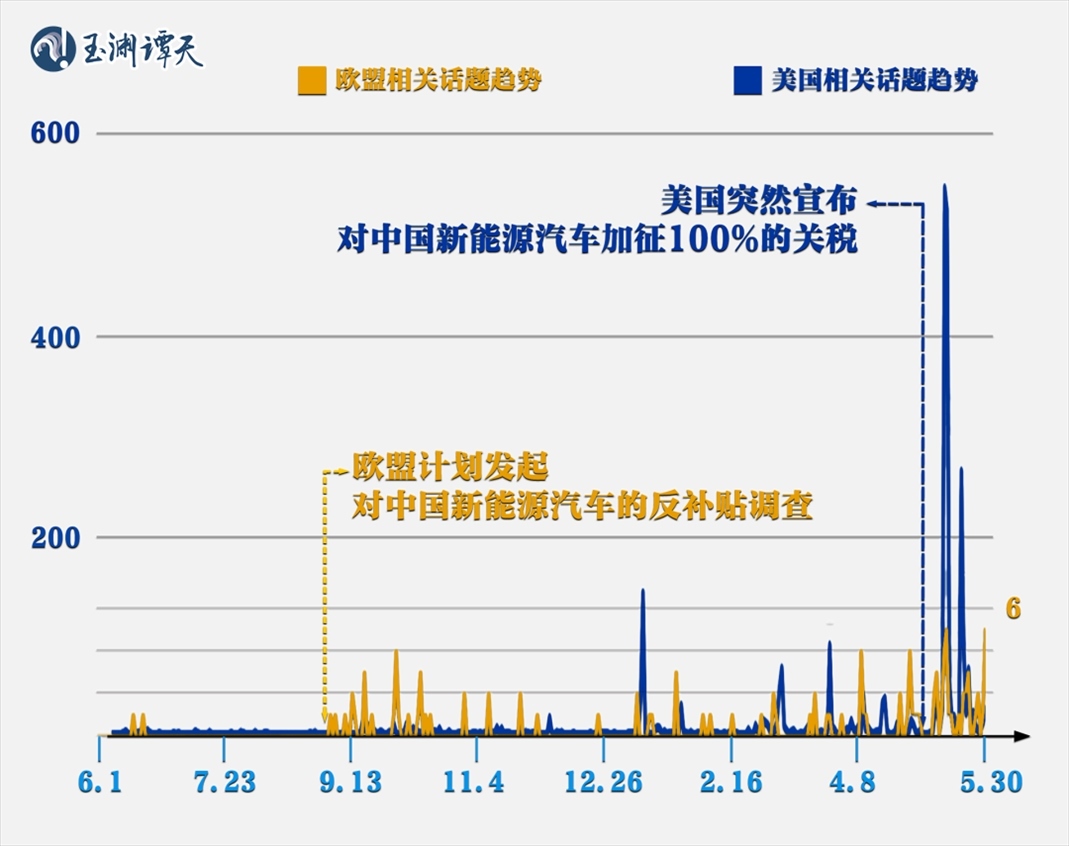 譚主分地區(qū)集納了過去一年外媒關(guān)于“對(duì)中國新能源汽車加征關(guān)稅”的報(bào)道,發(fā)現(xiàn)美國和歐洲地區(qū)出現(xiàn)了明顯的錯(cuò)峰: