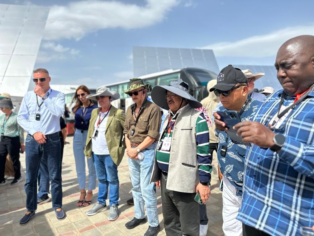 在首航高科敦煌100兆瓦熔鹽塔式光熱電站的吸熱塔前,外交官們對(duì)中國(guó)新能源技術(shù)應(yīng)用和產(chǎn)業(yè)發(fā)展表現(xiàn)出極大興趣,一邊提問(wèn),一邊用手機(jī)拍攝眼前的震撼場(chǎng)景。