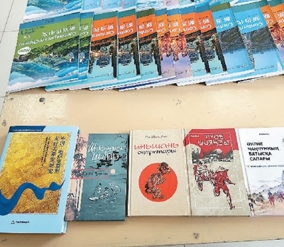 在孔子學(xué)院文化活動(dòng)室桌面上,擺著幾本用哈薩克語翻譯的中國(guó)書籍,《邊城》《駱駝祥子》《長(zhǎng)春真人西游記》《陰山汪古》等等。