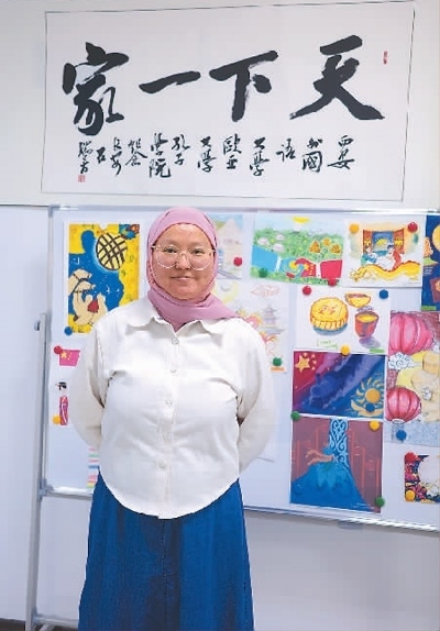 學(xué)生麗扎·穆罕默德在孔子學(xué)院書畫墻前留影。本報(bào)記者 劉少華攝