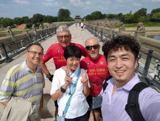 意大利自行車手阿爾貝托·菲奧林(后排左一)和迪諾·法基內(nèi)蒂(后排左二)騎行到達(dá)北京后與友人合影留念。