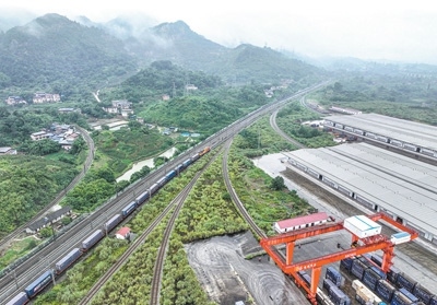 6月27日,西部陸海新通道中老泰馬跨境鐵路班列在重慶江津小南埡站發(fā)車(無人機照片)。該班列的開行將促進通道沿線地區(qū)與東盟國家的經(jīng)貿(mào)合作和產(chǎn)業(yè)聯(lián)動。新華社記者 唐 奕攝