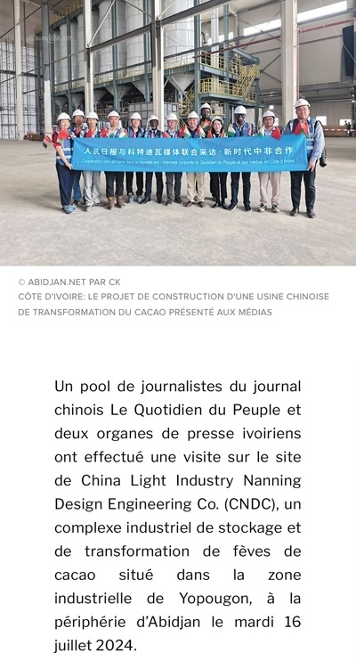 7月16日,人民日報(bào)與兩家科特迪瓦新聞機(jī)構(gòu)記者一行參觀了由中國輕工業(yè)南寧設(shè)計(jì)工程有限公司總承包的可可加工及可可豆倉庫建設(shè)項(xiàng)目,該項(xiàng)目坐落在阿比讓郊區(qū)的約普貢工業(yè)區(qū)。該公司負(fù)責(zé)人指出,該項(xiàng)目綜合體計(jì)劃于2024年年底完工,包括一個(gè)可加工5萬噸可可豆的工廠、可存儲14萬噸可可豆的倉庫以及培訓(xùn)中心、行政大樓等?!钥铺氐贤甙⒈茸尵W(wǎng)報(bào)道