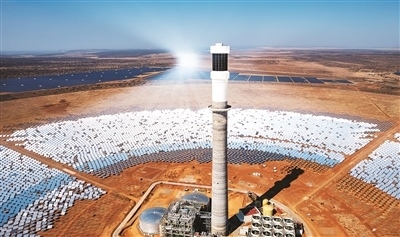 在南非北開普省拍攝的南非紅石100兆瓦塔式熔鹽光熱電站項目。新華社記者 張譽東攝