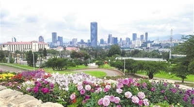 友誼廣場入口,外墻上四個遒勁有力的漢字“友誼廣場”躍入眼簾,紅底白字,分外醒目。走進(jìn)其中,目光所及皆是綠色,樹木蔥蘢、青草葳蕤,頓覺神清氣爽,仿佛踏入一個天然氧吧。廣場依山而建,高處連綿起伏的琴弦狀花帶,如同一條條彩帶在空中飛舞;半山腰空曠的廣場上,可遠(yuǎn)眺中央商務(wù)區(qū)的城市景觀;山腳的人工湖波光粼粼,倒映著藍(lán)天白云和綠樹紅花……